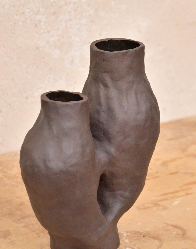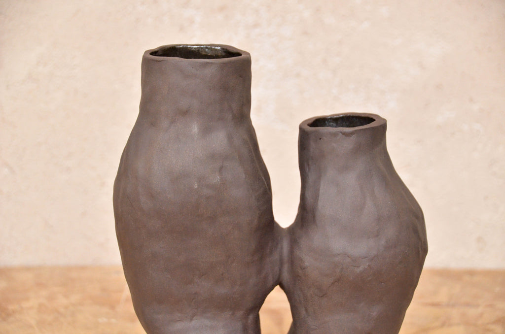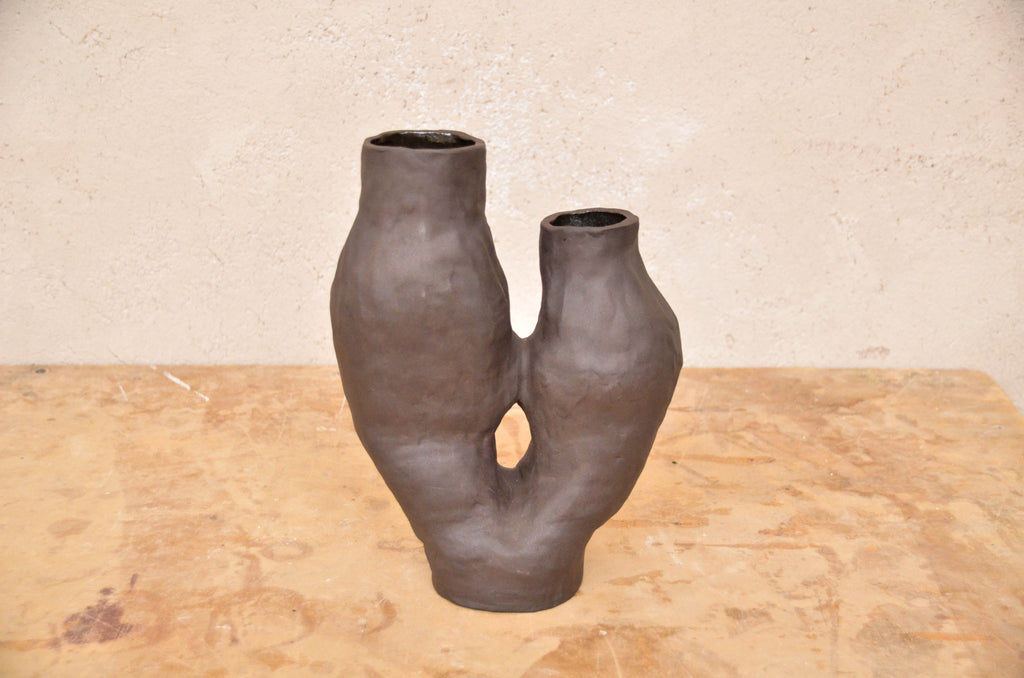 One off, original, textured by hand, this character piece has two openings and may be used as a functional vessel. A symbol of integrity, the duality of pulling forces highlight equilibrium and harmony.